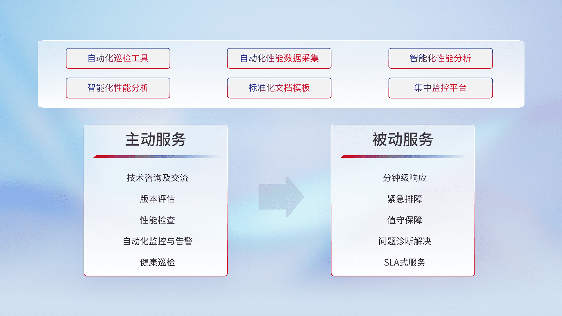 智能化工具和标准化文档,,,,保障服务质量,,,,提供主动服务(包含技术咨询、、、版本评估、、、、性能检查、、自动化监控与告警、、健康巡检)和被动服务包含(分钟级响应、、、、紧急排障、、值守保障、、、问题诊断解决、、、、SLA服务)。。。