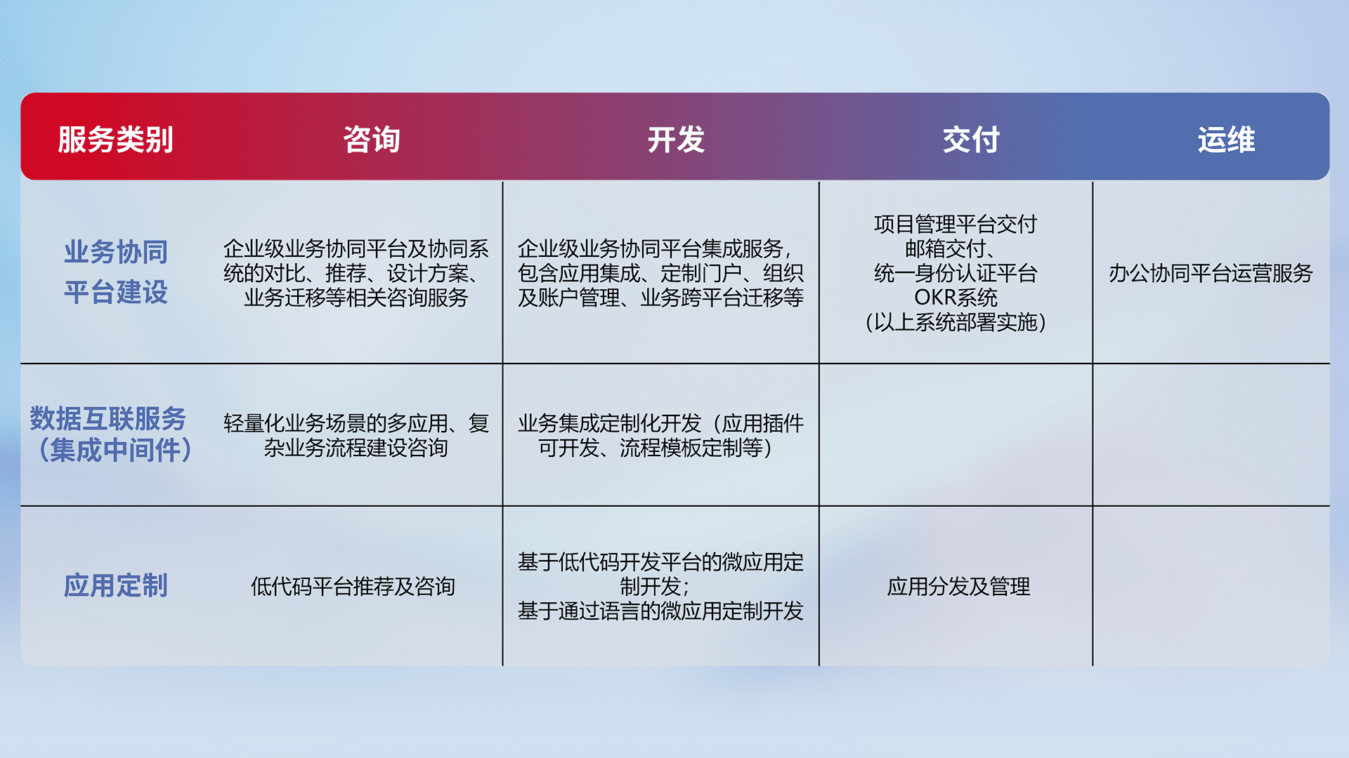 针对钉钉、、、企微、、、、IDaas等平台级产品提供产品的规划、、方案、、、交付、、定制化开发等服务,,实现如统一协同办公、、智能客户服务、、混合会议管理、、、、智能数据查询、、等业务场景,,,,实现数字化转型。。。。